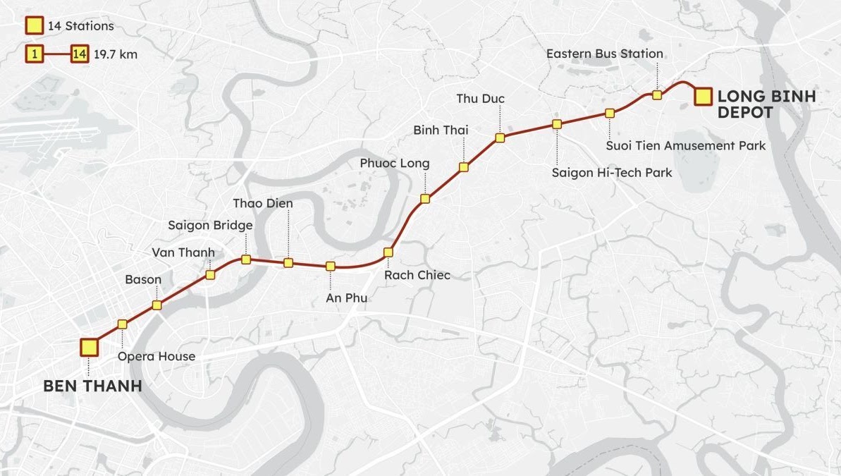 - 🚇 Linka 1 – v provozu: Trasa Bến Thành ↔ Suối Tiên, délka 19,7 km, 14 stanic.